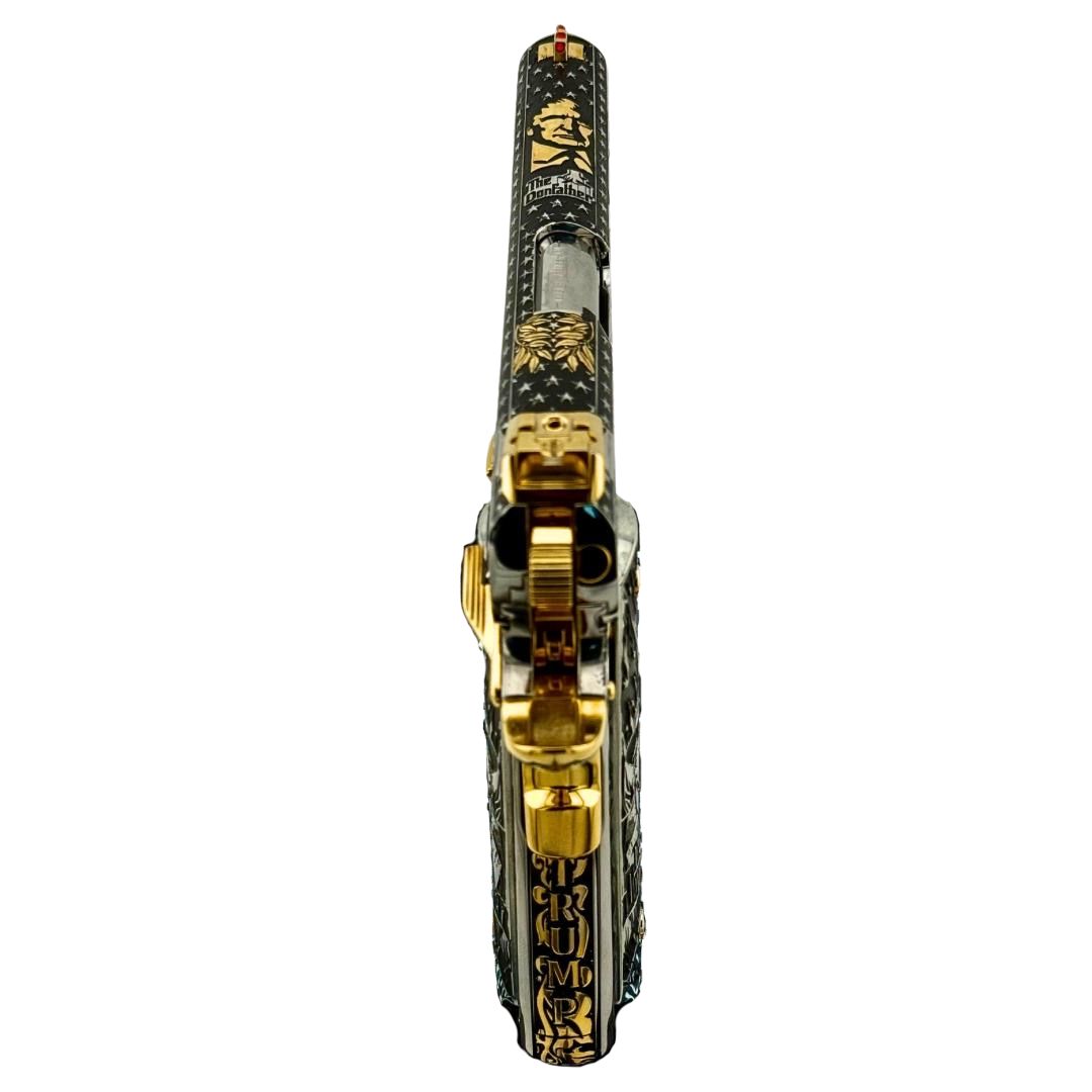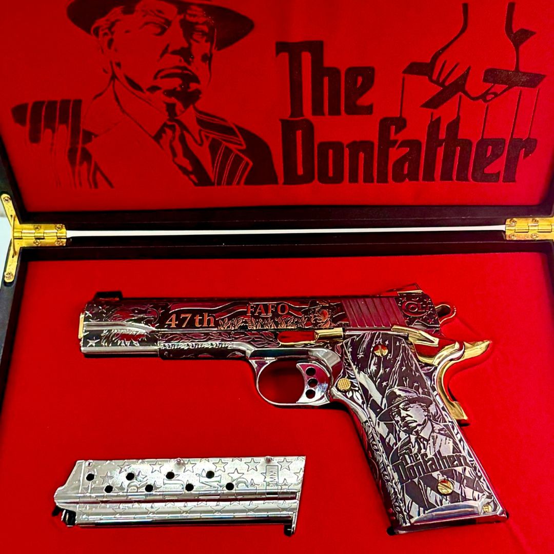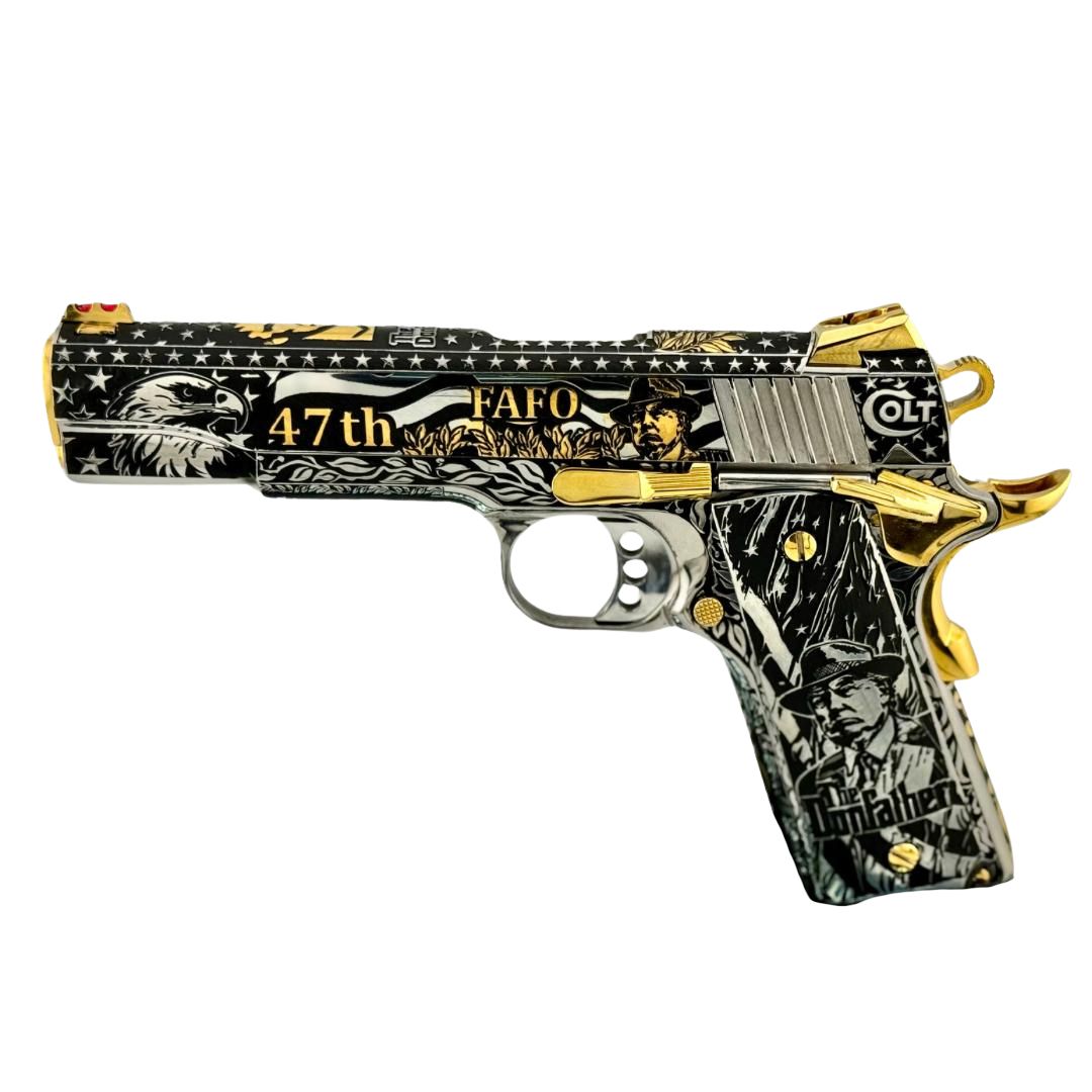 Introducing the Teflon Don Series Don Father Edition, a one-of-a-kind tribute that fuses the fearless presence of Donald J. Trump with the iconic mystique of The Godfather. Built on the time-honored Colt 1911 platform, this custom showpiece is engraved with bold imagery—from the 45th & 47th presidential nod to the unmistakable FAFO message—capturing strength, leadership, and legacy in every detail. The design features striking gold accents, a powerful black-and-silver contrast, and deep custom engravings of both patriotic and cinematic influence. Created for collectors who appreciate bold craftsmanship and symbolic artistry, the Don Father Edition is more than a firearm—it’s a legacy, fit for our commander in chief.